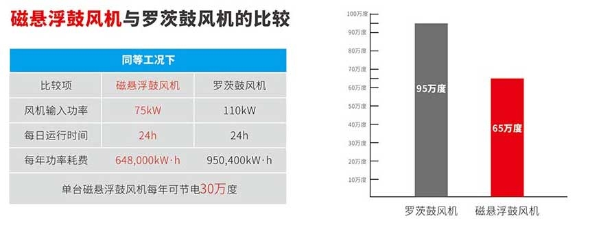 ◇ 以100kW磁懸浮鼓風機為例。與羅茨風機相比,每臺磁懸浮風機可節省30萬千瓦時以上的電能和20萬元以上的電費。
